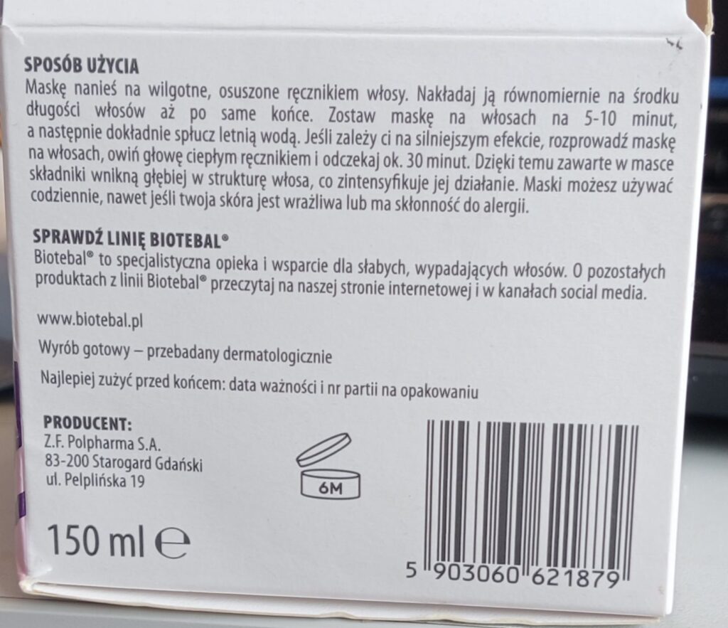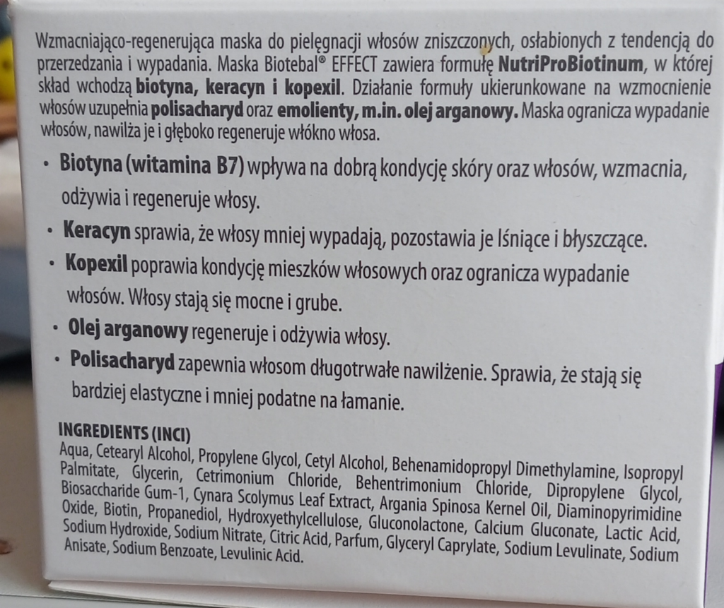 Maska Biotebal® EFFECT to skuteczny produkt do regeneracji włosów, zwłaszcza dla osób z problemem osłabienia i wypadania. Zawiera kluczowe składniki aktywne, takie jak biotyna, kopexil, olej arganowy i polisacharydy, które wspierają zdrowie włosów. Efekty są widoczne już po kilku zastosowaniach, a po 1-2 miesiącach regularnego stosowania można zauważyć ograniczenie wypadania i wyraźne wzmocnienie włosów. Jednak osoby z wrażliwą skórą głowy powinny zachować ostrożność ze względu na konserwanty i substancje zapachowe.